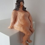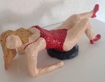 2013model liggend op een kussentje. Beeld van keramiek en acryl. Door de kwetsbaarheid van het werk is het alleen op te halen uit Drenthe of in overleg te brengen